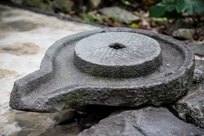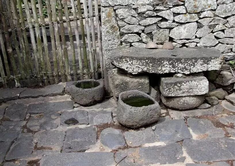 在这里,随处可见古代石器,房屋内接水用的大盆、磨粮食的磨具、装饰用的路引,均是火山岩打造。